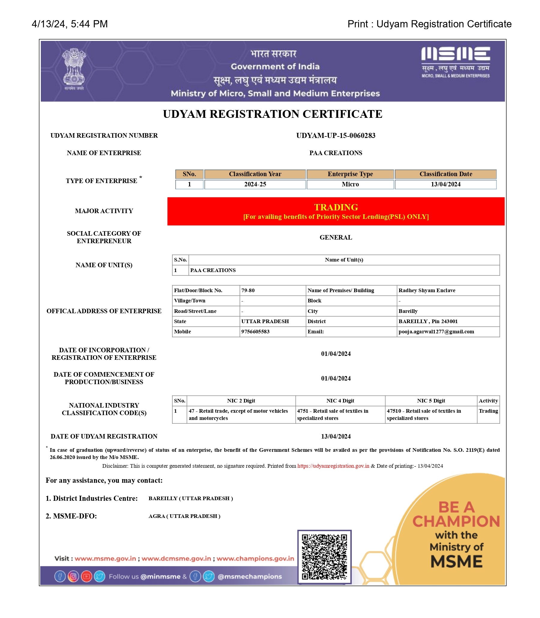 MSME Registration Certificate