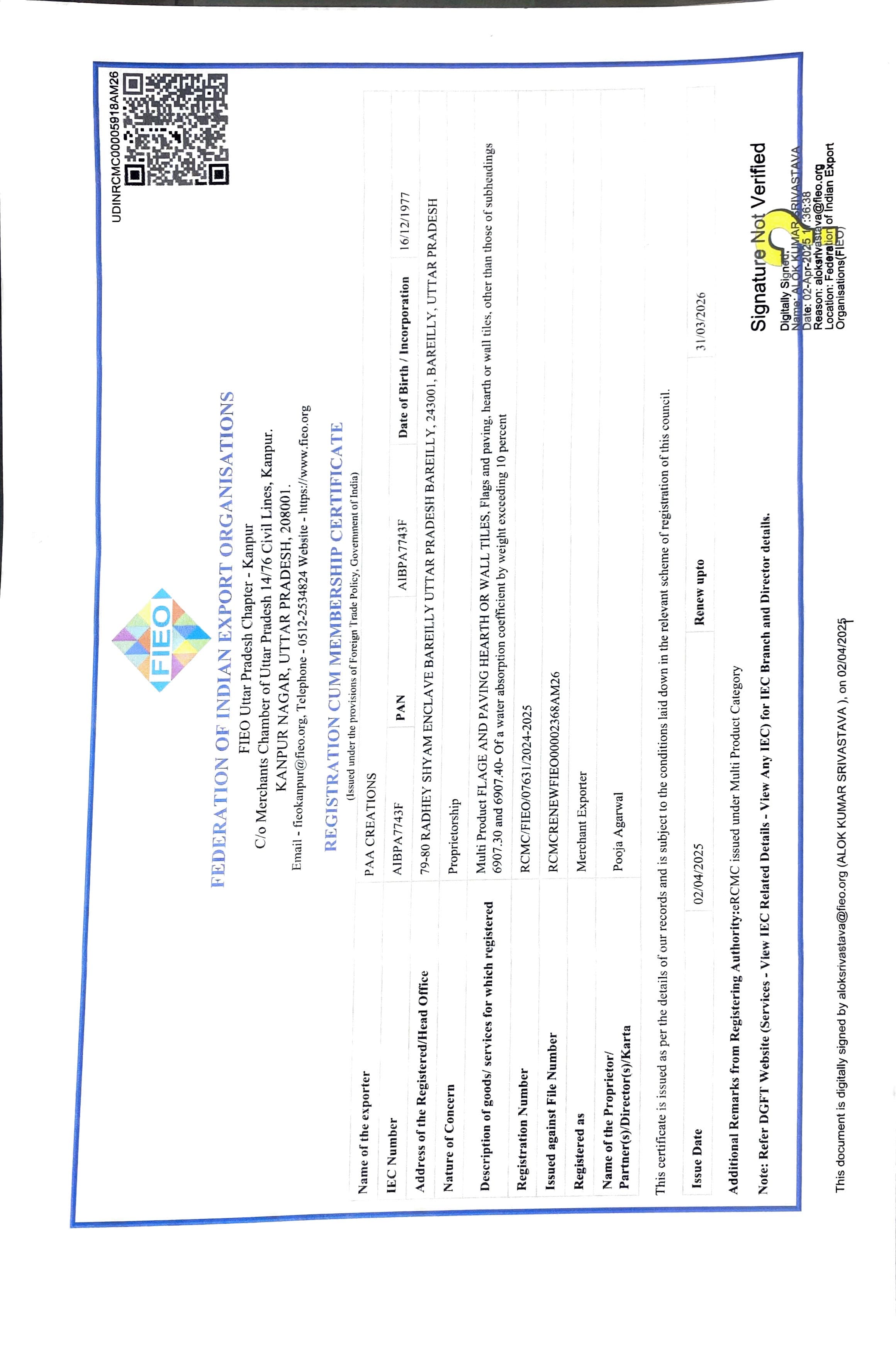 This FIEO Membership certificate, issued by the government, certifies our business as genuine and trustworthy, so you can have complete confidence in working with us.